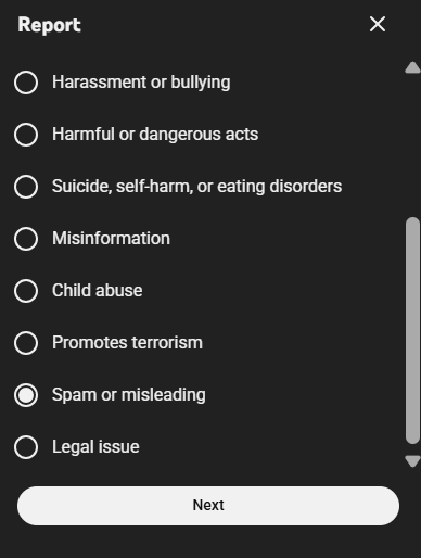 To report, you open the video, click on “Report,” choose the reason that fits, and submit it. You can also report comments the same way.